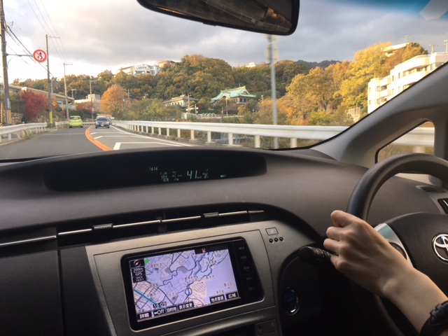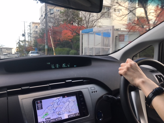 次は摂津本山駅前にある友達のマンションまで下って行きますが、見る余裕はないですが住吉川沿いは紅葉が美しく、山手幹線を走ってマンション駐車場では、お友達の車が私の教習車と同じプリウスなので、初心者さんでも簡単に入れる事が出来る車庫入れ方法をお教えしバッチリ入庫できて
