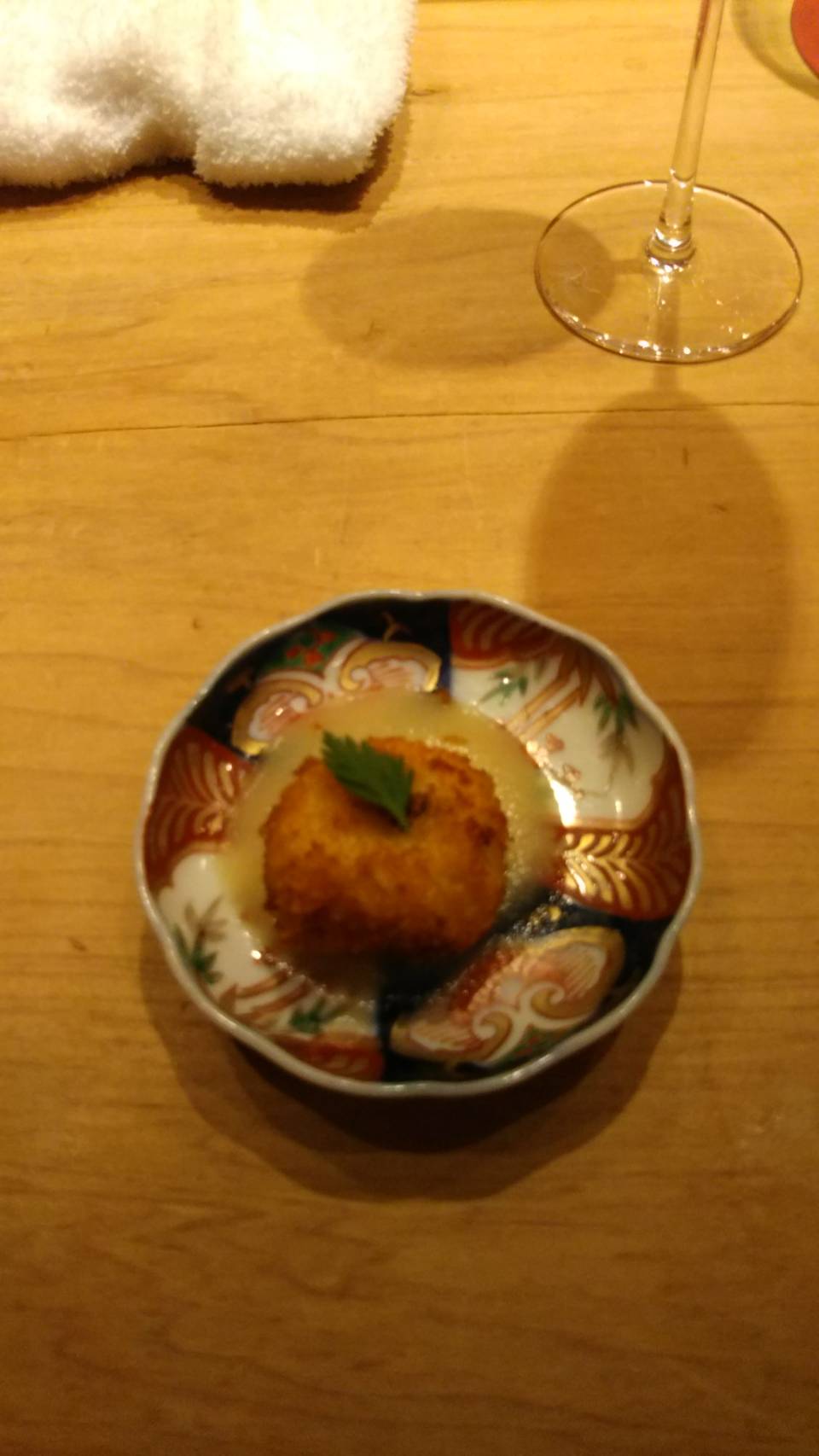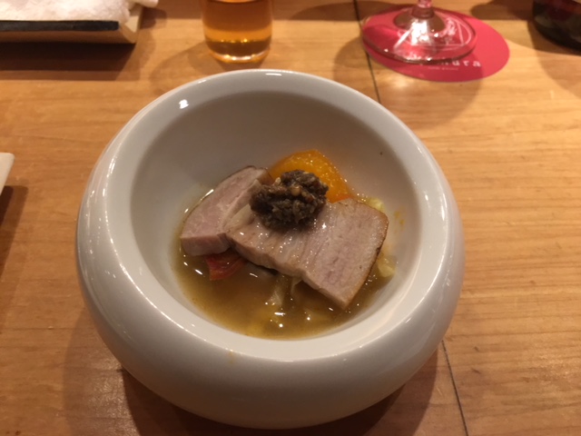 全て料理が出される度に詳しい説明が有って、カンター越しに見える料理人さんの腕さばきのライブを楽しみながら、そして偶々私の横に座ってられてた初老の男性から御声をかけていただいた時に、「今日は私の誕生日で、初めて奥村さんに寄せてもらいました」と話すと、この店の常連客さんでオーナーの奥村さん御紹介して頂いて