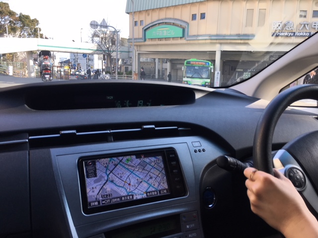 ご自宅近くの阪急御影駅前で待ち合わせて、早速運転席に案内しシート調節にミラーの合し方から教習し、先ずは阪神御影駅近くの電気量販店まで少し補助しながら怖々走ってもらい、駐車場で発券機の寄りを体験しましたが全く寄れず、こんな場合の処置の仕方も勉強